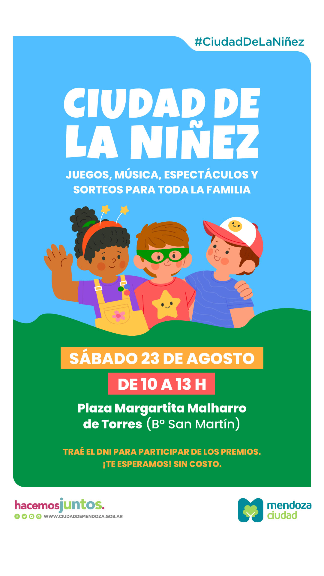 La Municipalidad de la Ciudad de Mendoza invita a participar de las celebraciones barriales por el mes de las infancias. Las actividades se desarrollarán el sábado 23 de agosto, de 10 a 13, en el Gimnasio Municipal Nº5, el Centro de Integración Comunitaria Nº 2, la plaza Margarita Malharro de Torres y el playón deportivo del barrio Sanidad.