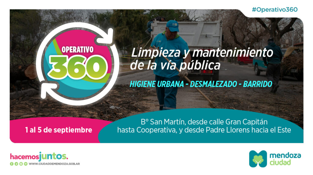 La Ciudad de Mendoza informa sobre los operativos 360 que se desarrollarán durante esta semana en un sector del barrio San Martín. El mismo está comprendido desde la calle Gran Capitán hasta Cooperativa y desde la calle Padre Llorens hacia el este.