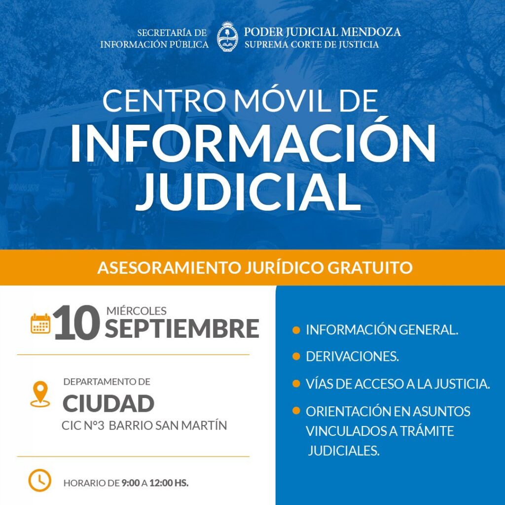 La Ciudad de Mendoza, junto al Poder Judicial, invita a vecinos y vecinas que precisen asesoramiento jurídico a participar de la jornada de atención del Centro Móvil de Información Judicial. El dispositivo se realizará este miércoles 10 de septiembre, de 9 a 12 horas, en el Centro de Integración Comunitaria Nº3, ubicado en el barrio San Martín.