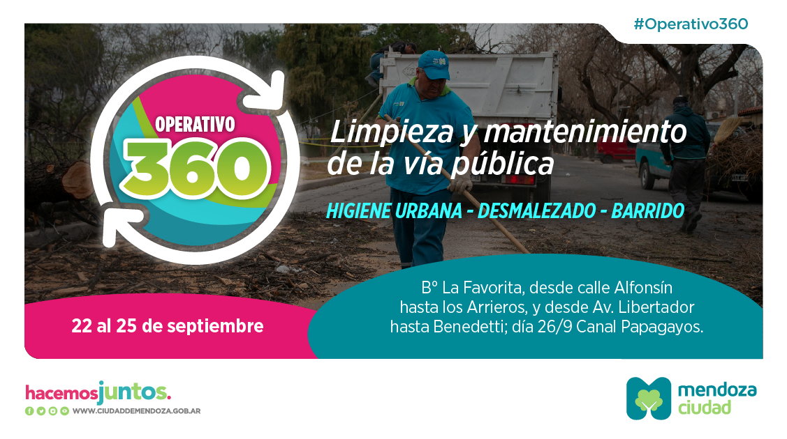 La Ciudad de Mendoza comunica que, hasta el 25 de septiembre, se concretarán los operativos 360, en un sector del barrio La Favorita. Dicha zona es la comprendida desde calle Alfonsín, hasta los Arrieros y desde Av. Libertador hasta calle Benedetti. Mientras que el 26/9 se desarrollará la limpieza del canal Papagayos, cuyo principal objetivo es mantener en condiciones a este importante cauce para la correcta evacuación de crecidas dentro del sistema aluvional de la provincia.