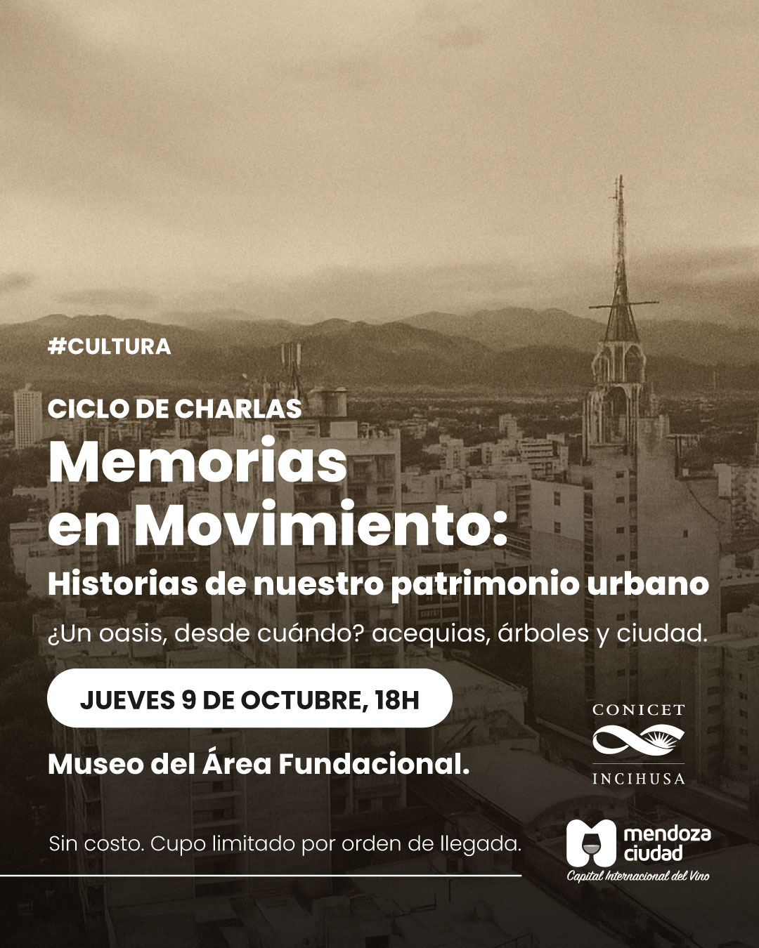 Esta charla aborda la historia del oasis urbano y el papel fundamental de las acequias y el arbolado en la configuración de la Ciudad. Se explorará cómo estos elementos moldearon el paisaje y la vida cotidiana desde fines del siglo XIX. La propuesta invita a redescubrir el sistema ciudad-oasis como parte esencial de nuestro patrimonio. El equipo de esta charla está compuesto por Clarisa Suden y Matías Esteves.