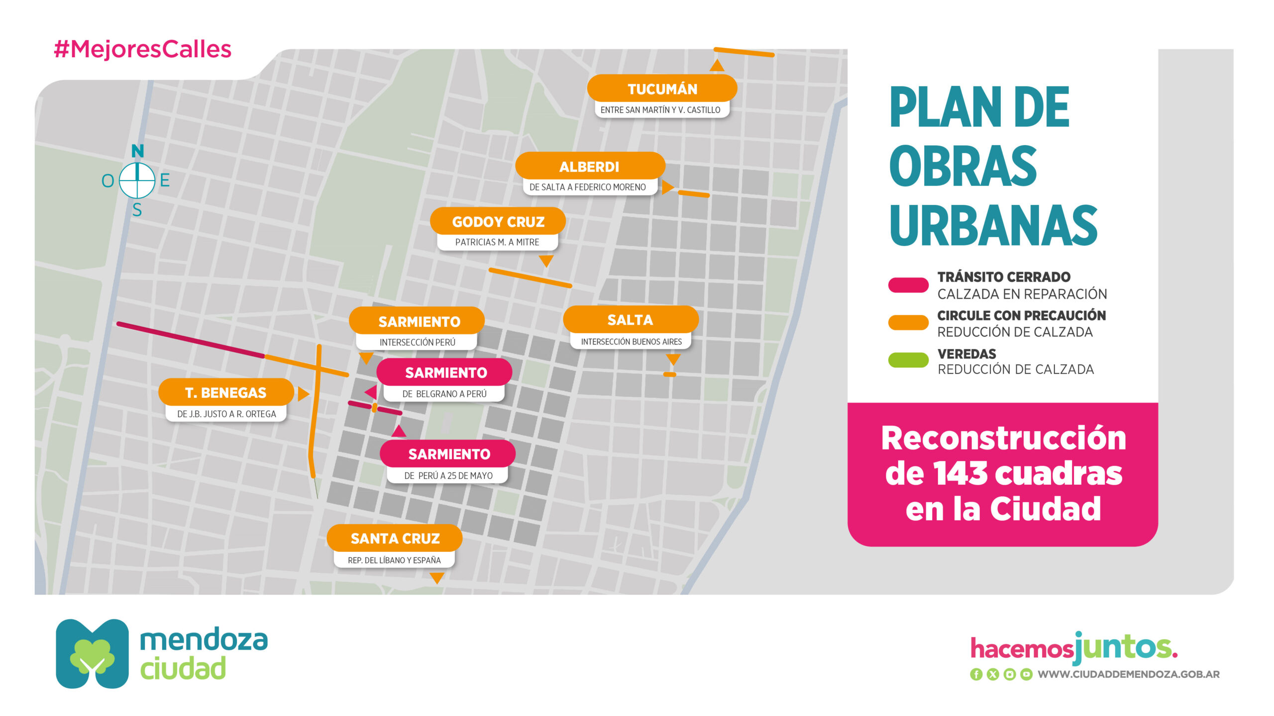 La Ciudad de Mendoza informa el estado actual de las calles que se encuentran con trabajos de reconstrucción de calzadas y mejoras en veredas. Estas acciones forman parte del Plan de Obras Urbanas, que contempla la renovación integral de distintas arterias y espacios públicos, en el marco de un cronograma de obras estratégicas para mejorar la transitabilidad y la infraestructura urbana.