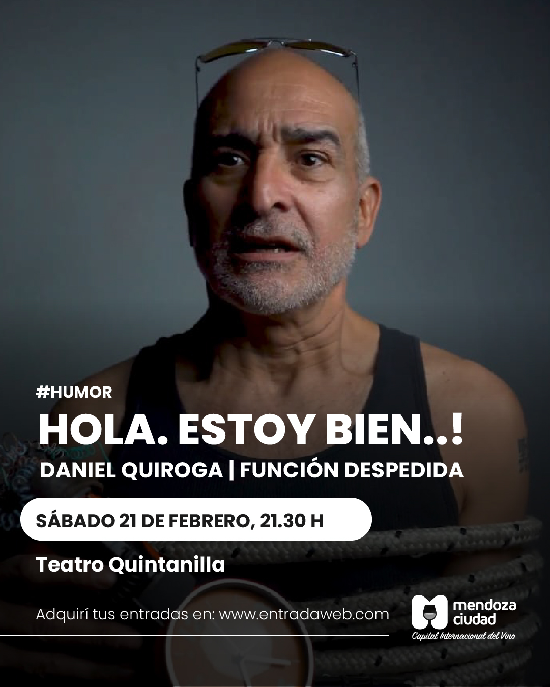 El reconocido actor mendocino Daniel Quiroga ofrecerá una función despedida de su espectáculo “Hola. Estoy bien..!” en la Ciudad de Mendoza. Será la última presentación antes de que el artista se aleje temporalmente de los escenarios locales, en un encuentro que promete risas, emoción y cercanía con el público. La propuesta podrá disfrutarse este sábado 21, a las 21.30h, en el Teatro Quintanilla.