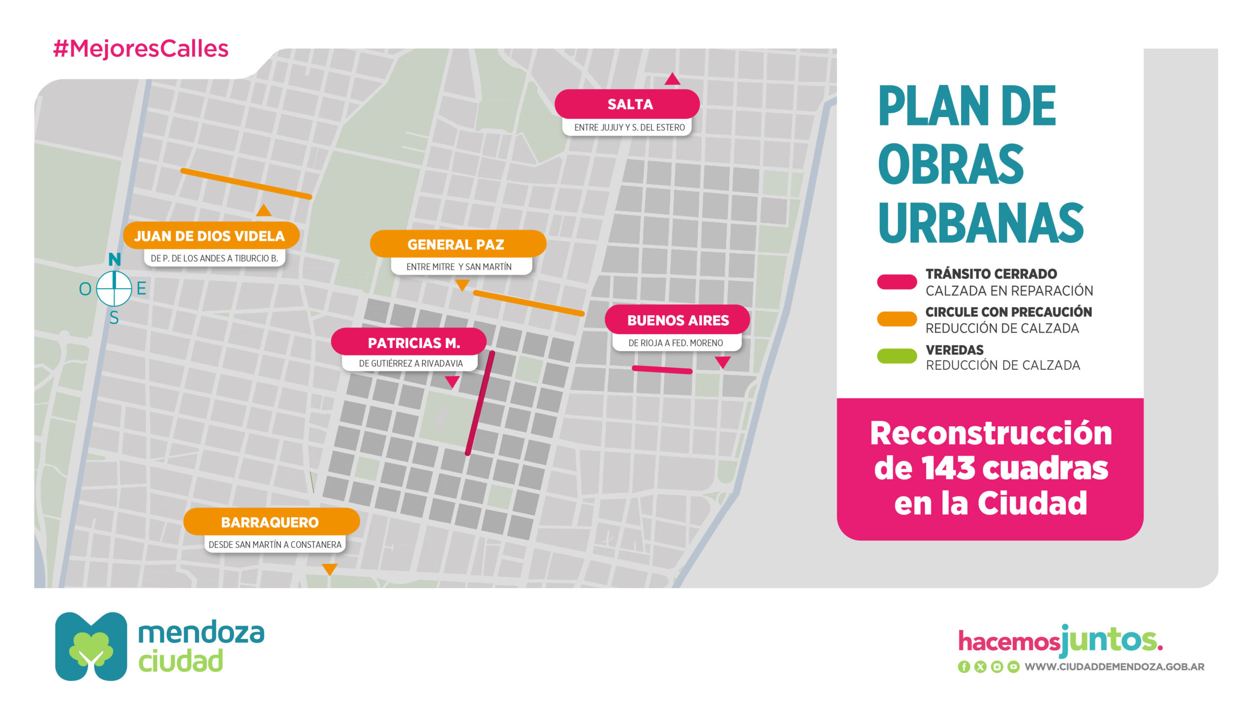 Es importante destacar que, a través del Plan de Mejoramiento y Reconstrucción de Calles, en la Ciudad se reacondicionarán más de 143 cuadras (aproximadamente 169.000 metros cuadrados de calzada), a partir de una importante inversión municipal, con lo que se busca ofrecer condiciones óptimas de circulación vehicular y peatonal.