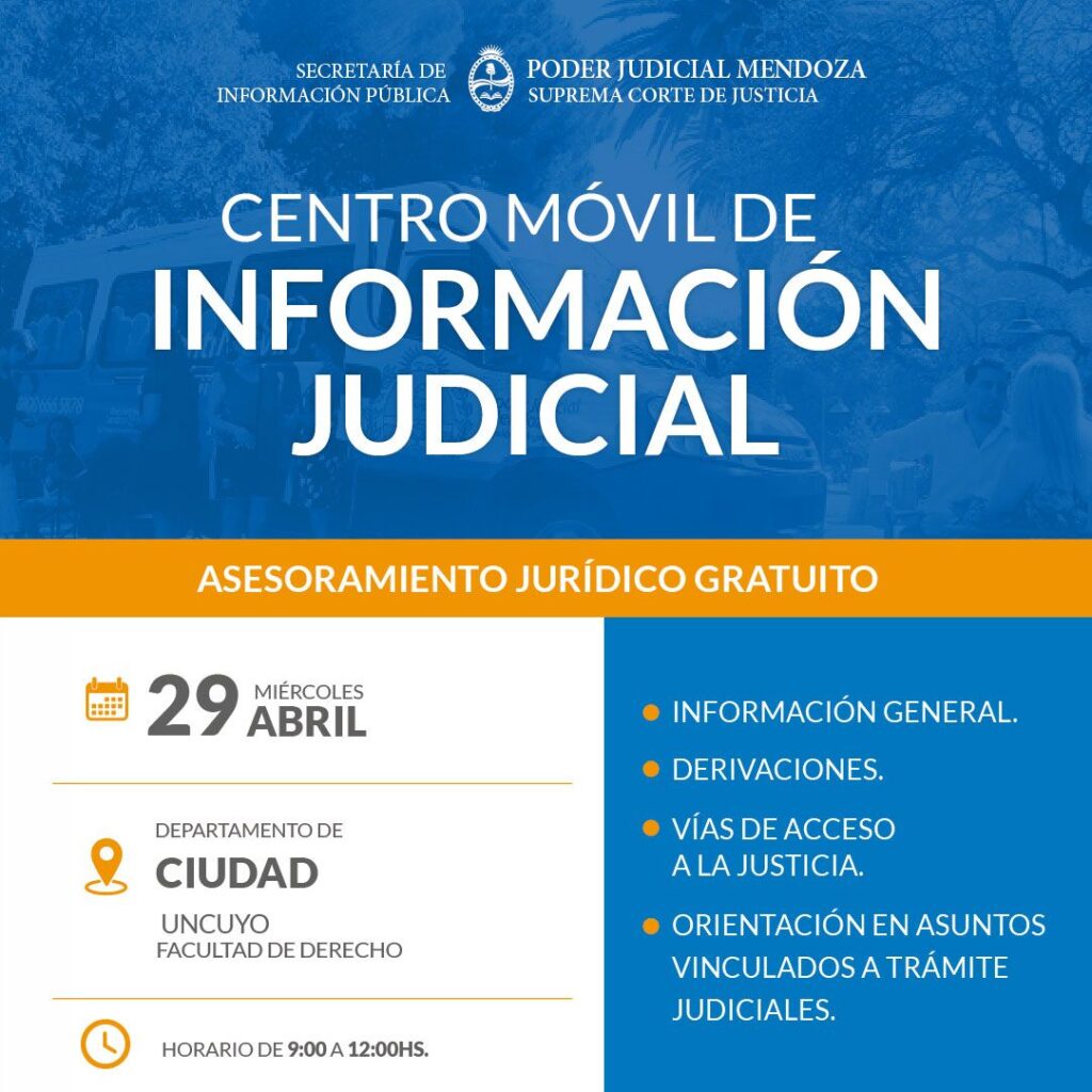El Centro Móvil de Información Judicial se instalará el miércoles 29 de abril en la Ciudad de Mendoza. El objetivo es acercar asesoramiento jurídico gratuito a vecinos y vecinas. La propuesta, impulsada por el Poder Judicial de Mendoza a través de su Secretaría de Información Pública, tendrá lugar en la Facultad de Derecho de la Universidad Nacional de Cuyo.